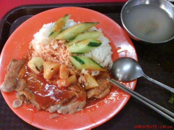 才7-8¥的茄汁雞扒(排)飯 :雞肉沒用酒醃過,很腥~ 但配菜還OK